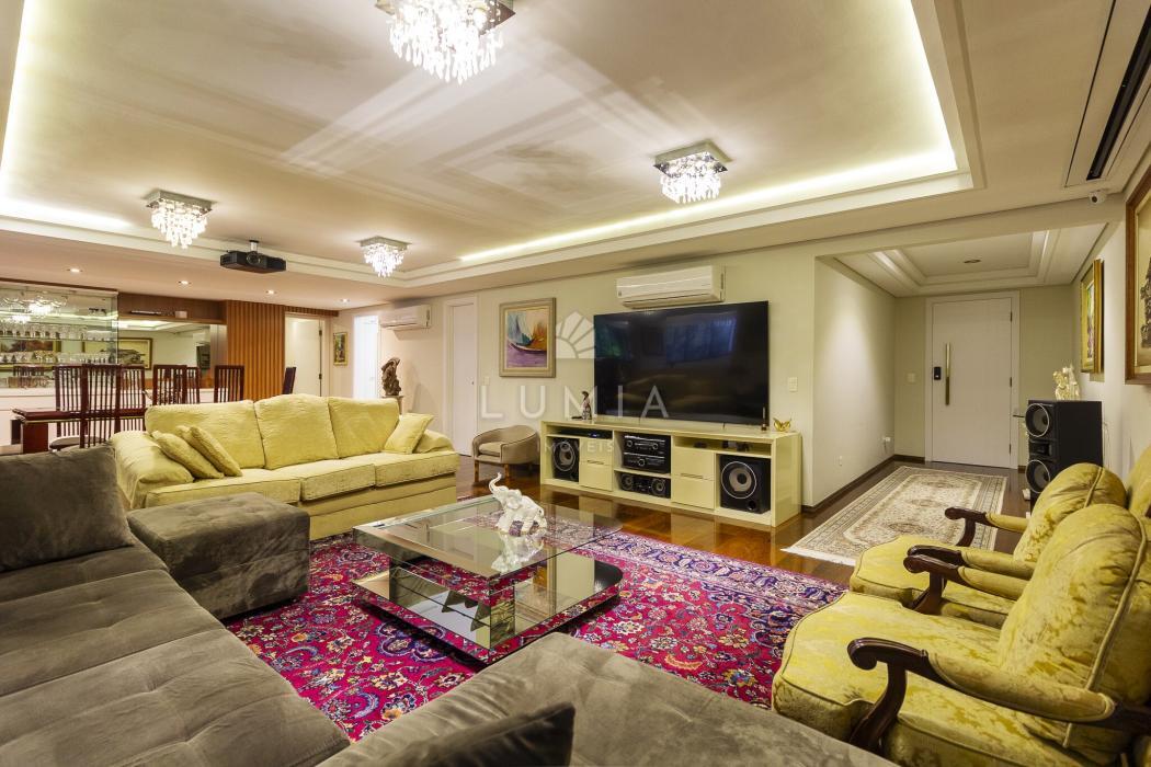 Preciosidade de apartamento, na melhor localização do Batel, a duas quadras da praça do Japão. Excelente em metragem, o imóvel conta com 240 metros, 4 quartos, 5 banheiros, três salas extremamente amplas, pussuindo uma delas um telão de 160 polegadas. Amplo, iluminado e arejado, com hall de entrada individual; living para 4 ambientes com pé direito alto;Duas vagas de garagem cobertas, estacionamento para visitantes, salão de festas, playground e portaria 24 horas.