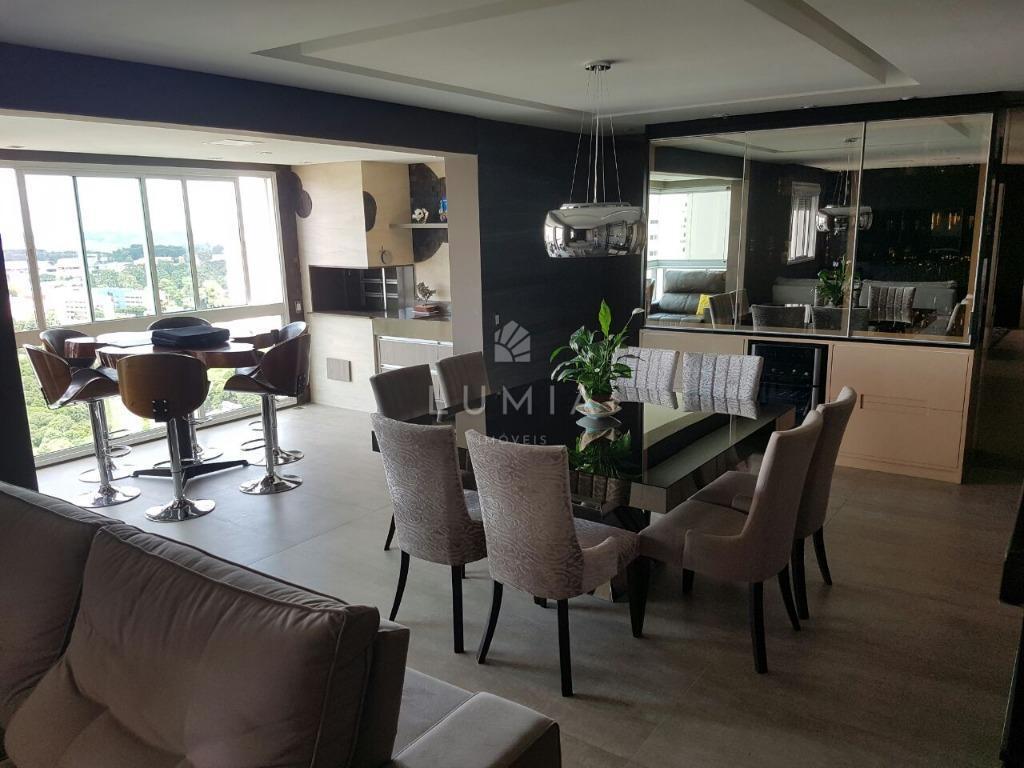Contém: lavabo, sala para 2 ambientes, totalmente decorada, cozinha mobiliada e equipada com todos eletrodomésticos; lavanderia equipada; sacada com churrasqueira à carvão, decorada com linda mesa em madeira maciça; escritório; suíte master com closet, banheiro social.