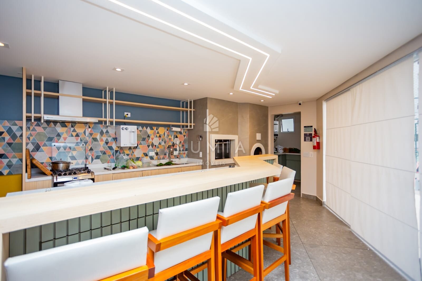 - Varanda com churrasqueira a carvão e grill, fechamento reiki e cortina rolô