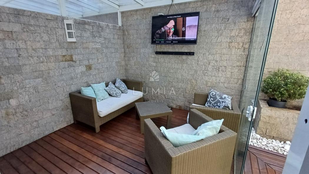 Espaço gourmet com churrasqueira a carvão, pia e sala de estar integrada com TV