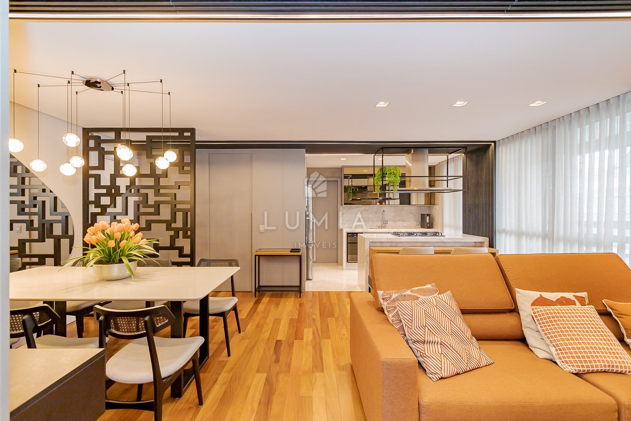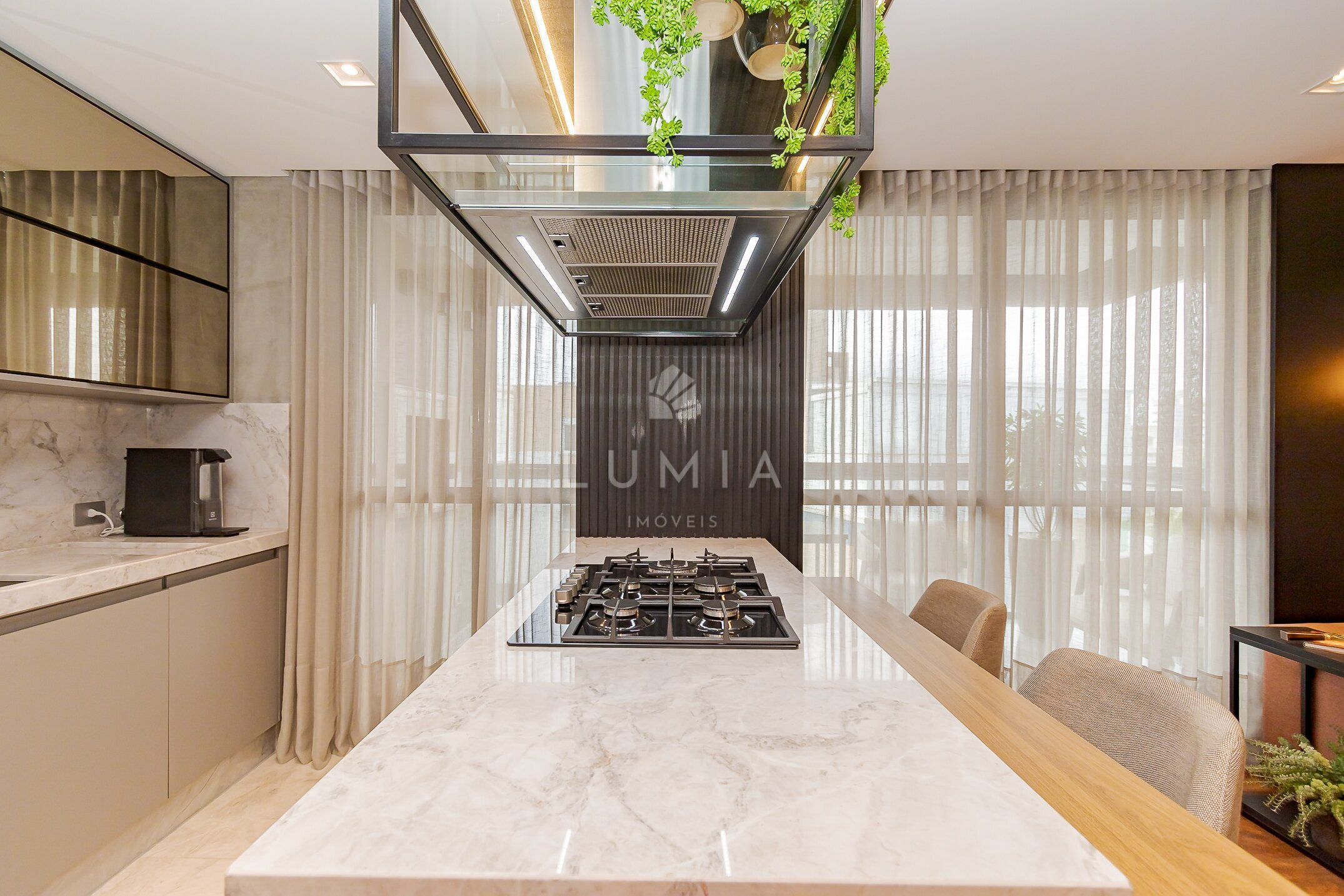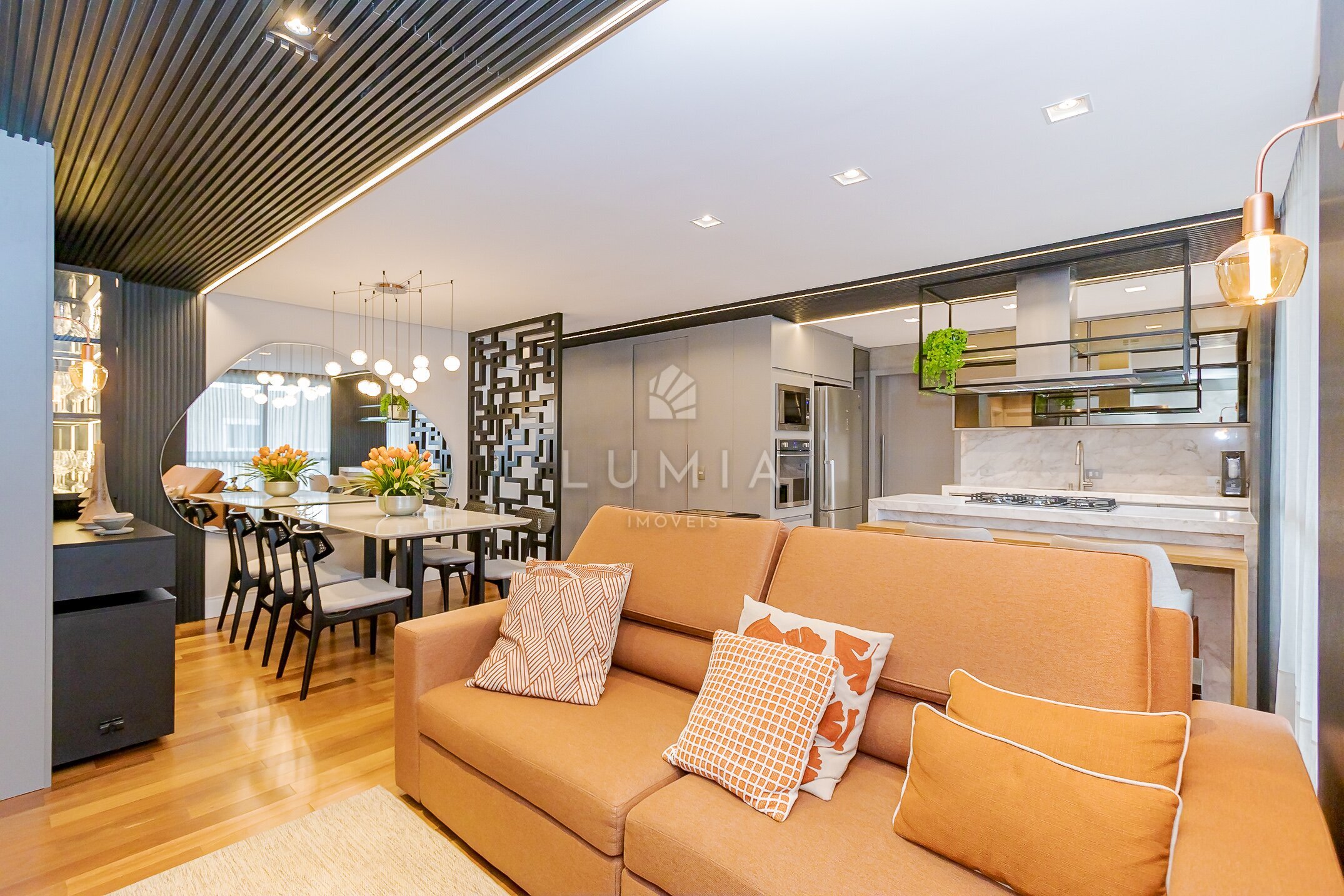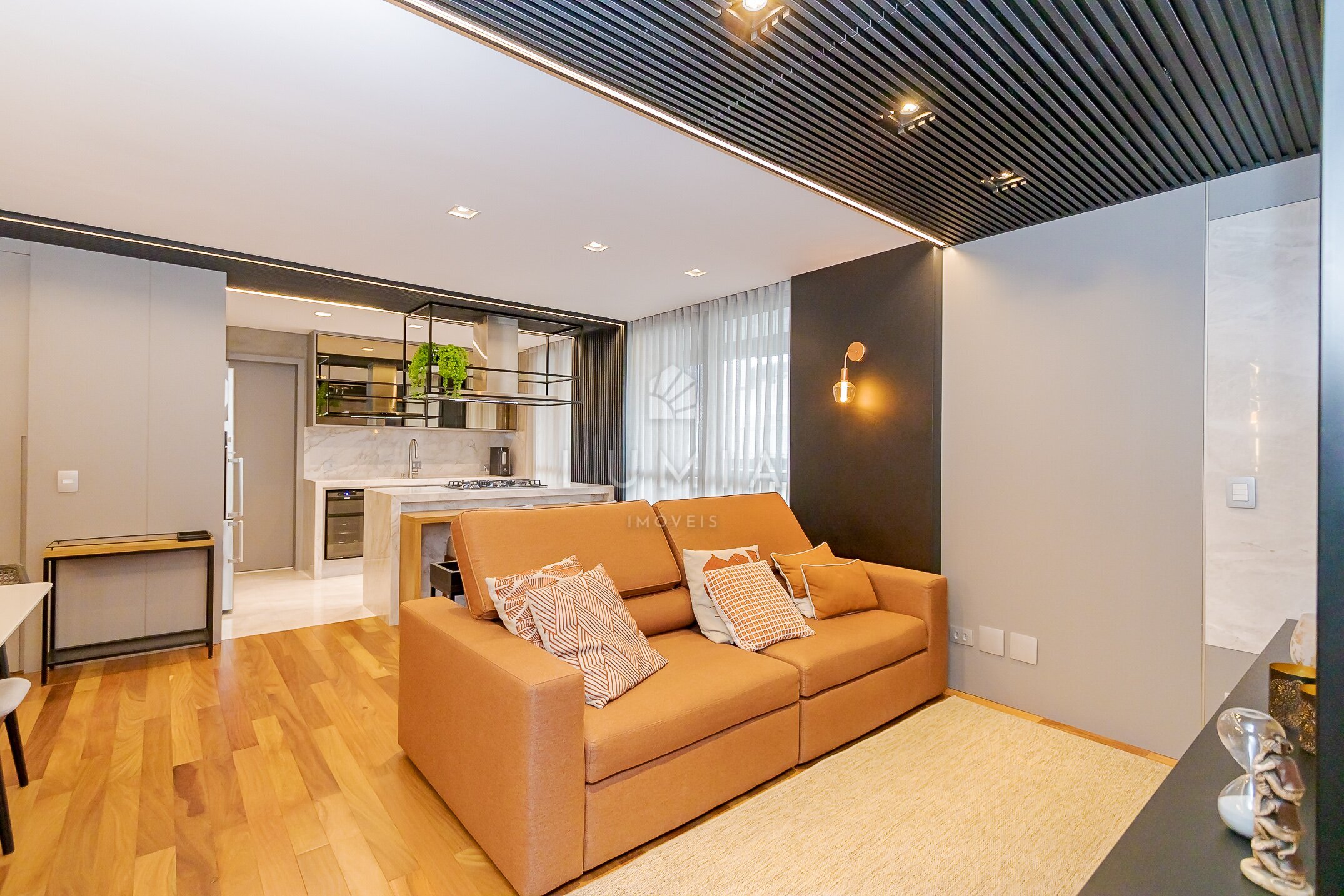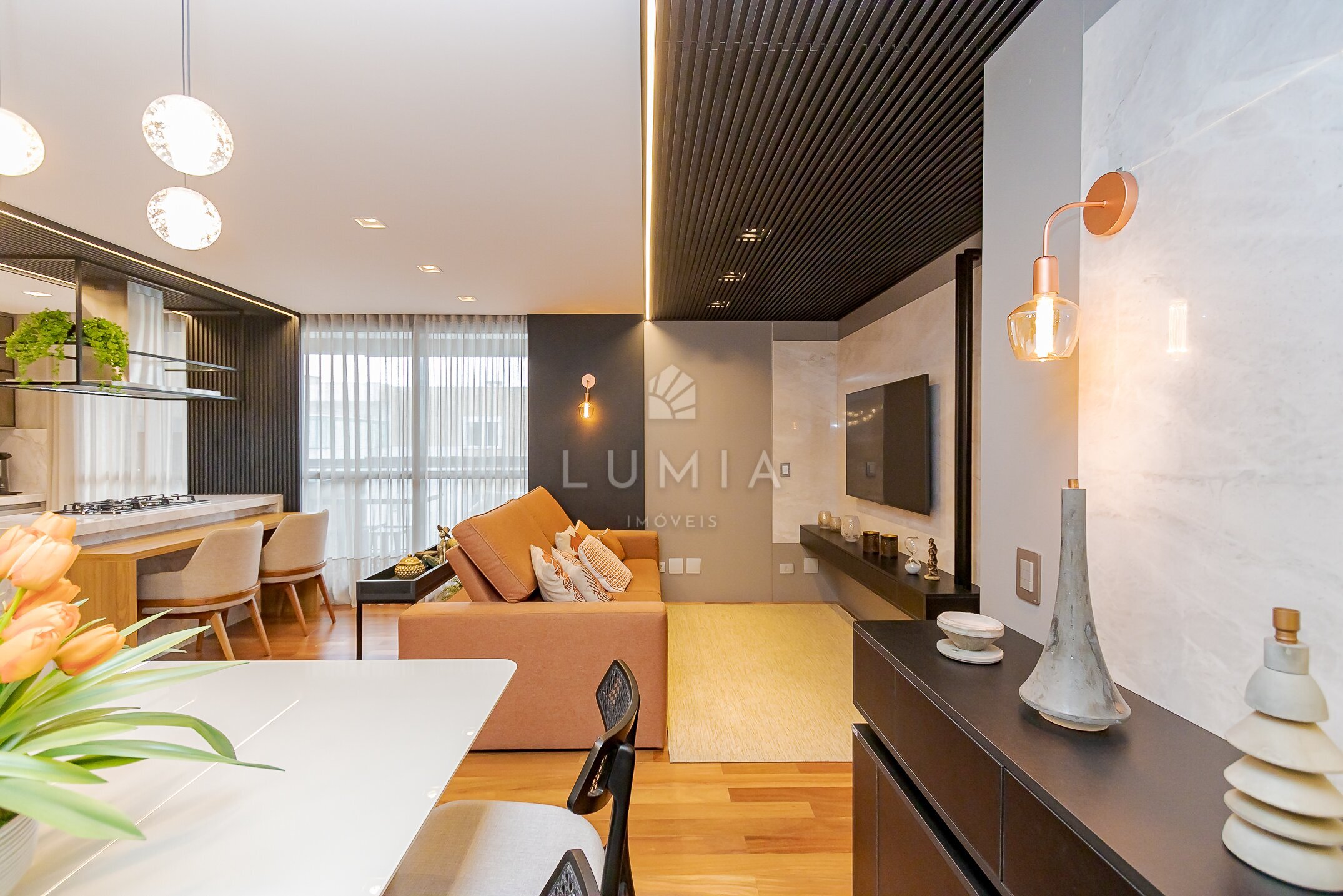 - Cozinha integrada com sala de jantar e TV