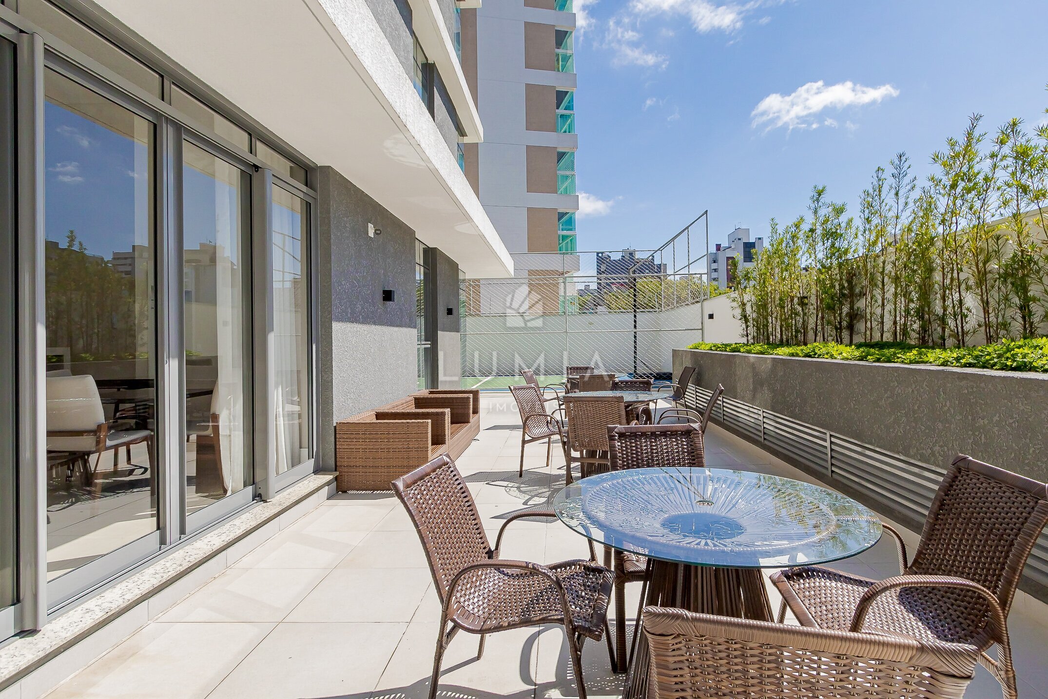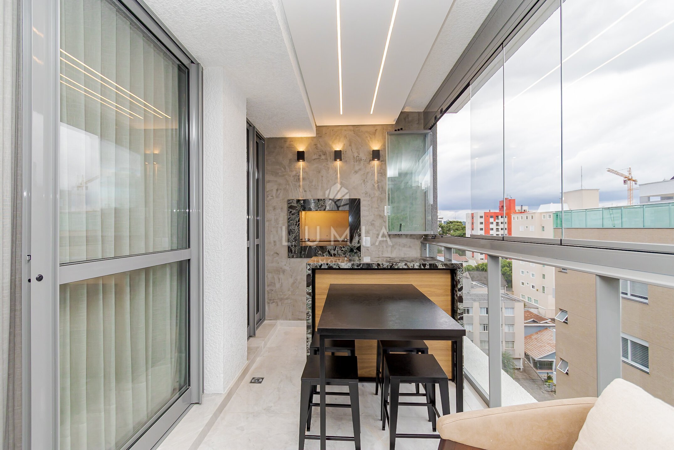 - Sacada com churrasqueira e fechamento com cortina de vidro